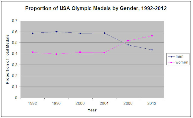 I’ve read a lot of talk recently about how this is the first Olympics where women have really stolen the show. There are some pretty clear indicators (this is the first Olympics where every competing country had at least one female athlete), but some are a little more tricky to draw conclusions from. For example, in terms of USA medal count, more women won medals than men (58 to 45)*.